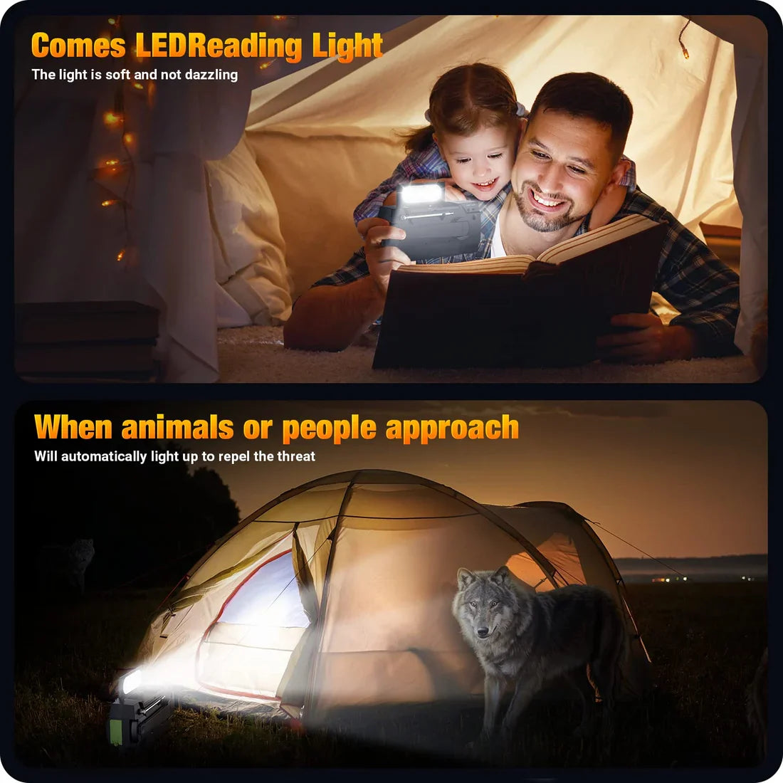 Emergency Features:Â 3-mode flashlight, motion sensor reading light, and SOS alarm button.